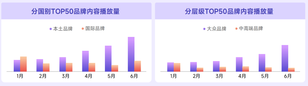 而从短视频的播放量来看,即便是在1月国外品牌视频输出高于国货品牌的月份,国货品牌的视频播放量也高国外品牌。